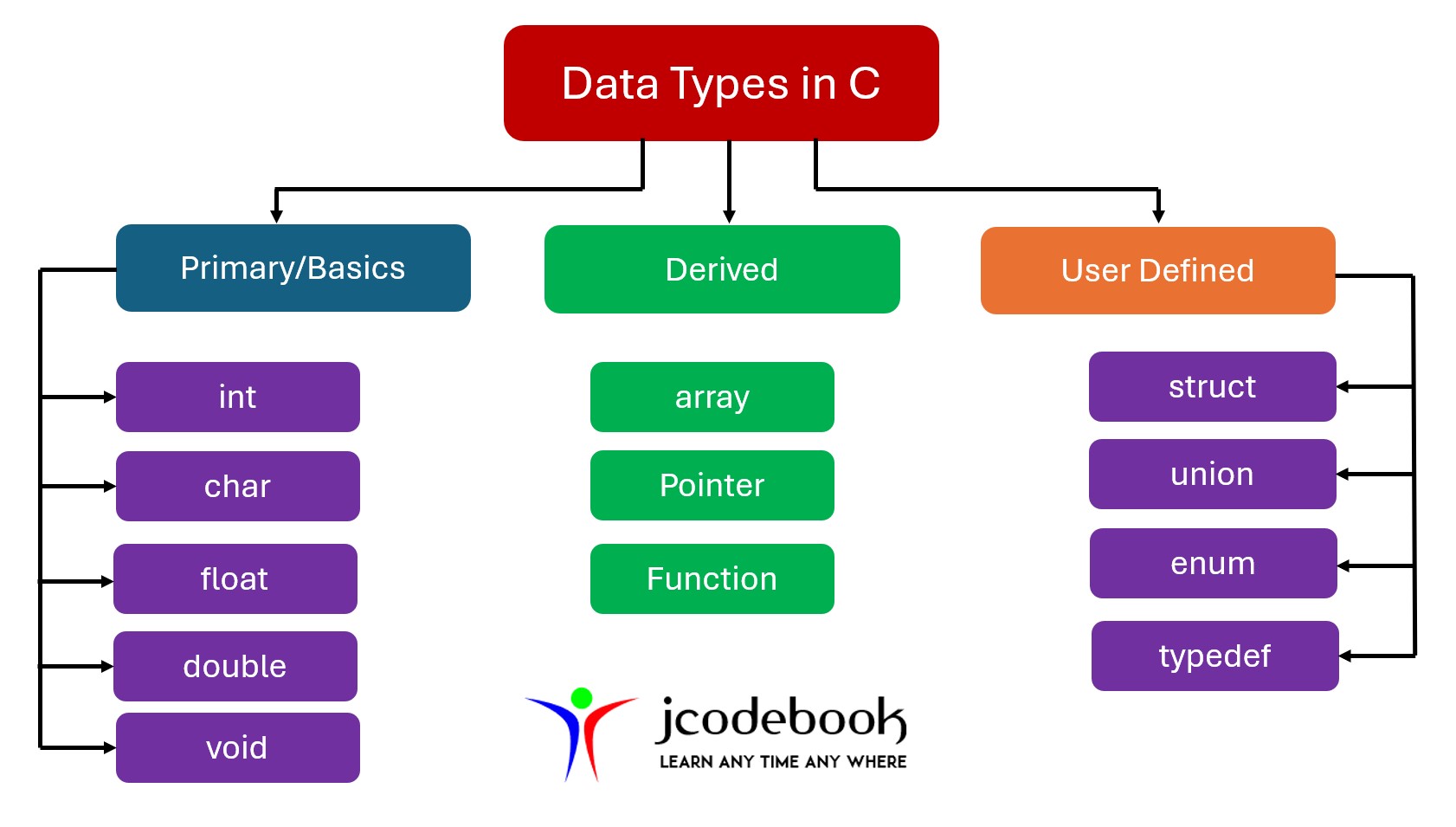 | Array | Collection of elements of same data type | int arr[5]; |