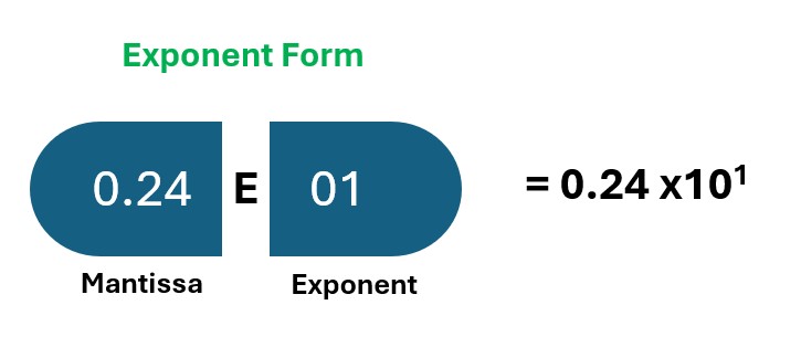 2.4 can be written as 0.24 x 101 = 0.24E01, where 0.24 is the mantissa part(before E) and exponent part is 1(after E).