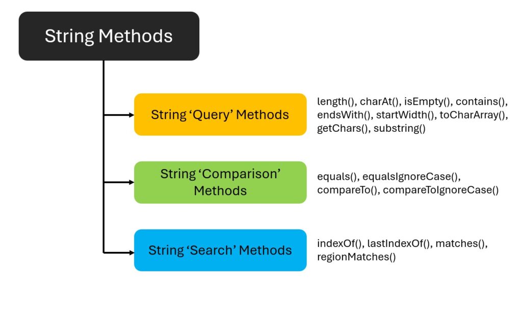 Here’s an overview organized into categories such as query, comparison, and searching of a String.