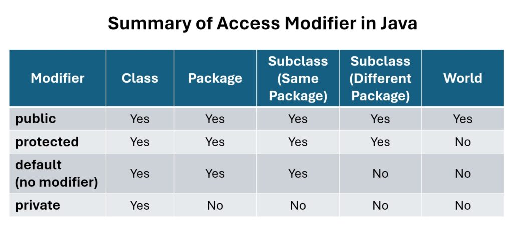 Here is the summary table of access modifiers in Java