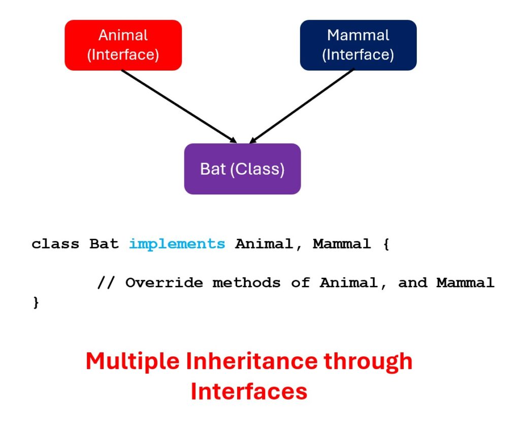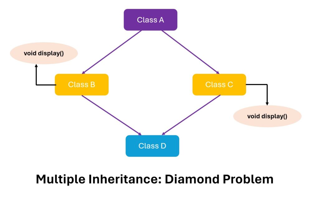 Note: Java does not support multiple inheritance directly through classes due to these complexities. However, Java allows multiple inheritance of behavior through interfaces.