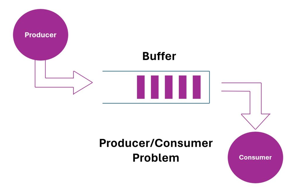 It describes a scenario where one or more producer threads generate data and put it in a shared resource (like a buffer), while one or more consumer threads retrieve and process that data.